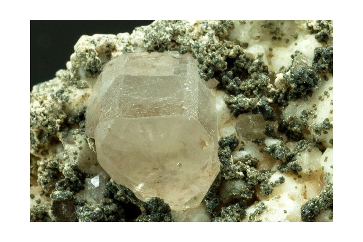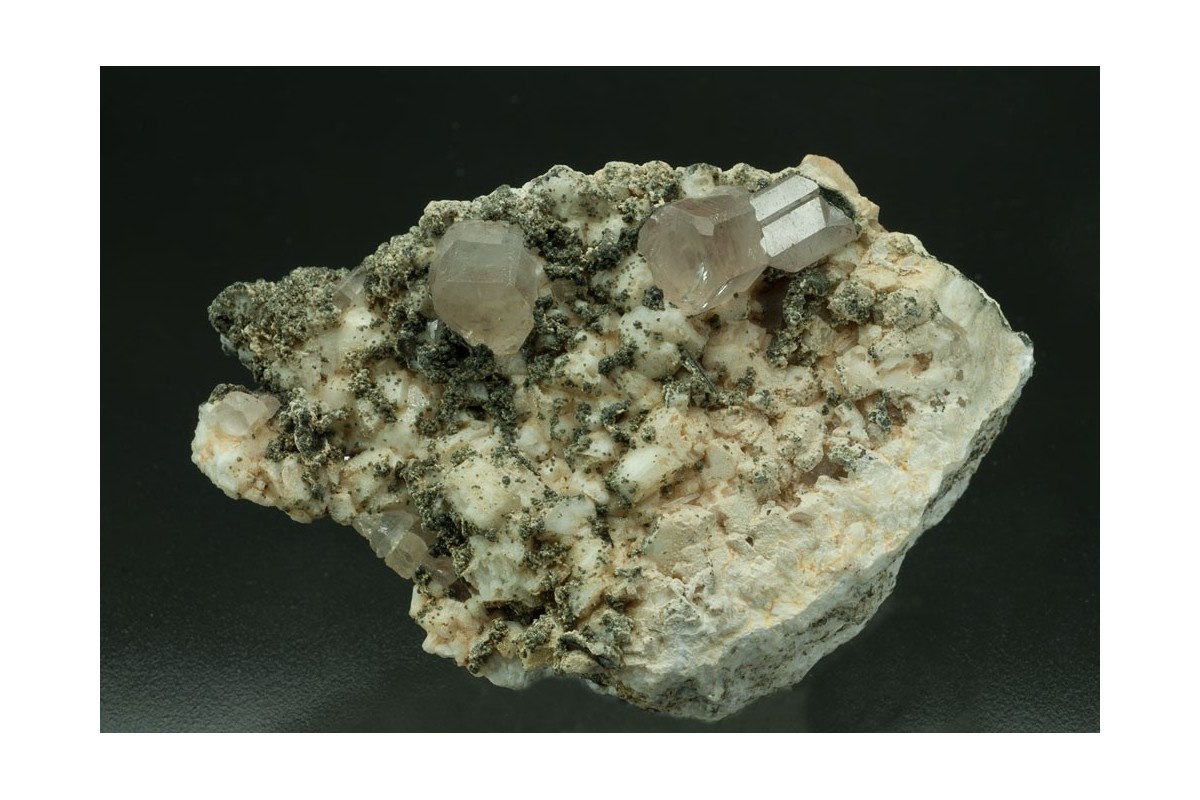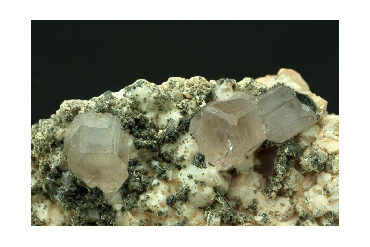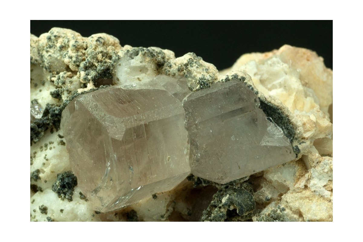 Specimen of pale sherry coloured apatite crystals, largest 10x8mm, pleasing set off on a matrix of feldspar, mica and other smaller apatite crystals. Apatite fluoresces bright yellow.